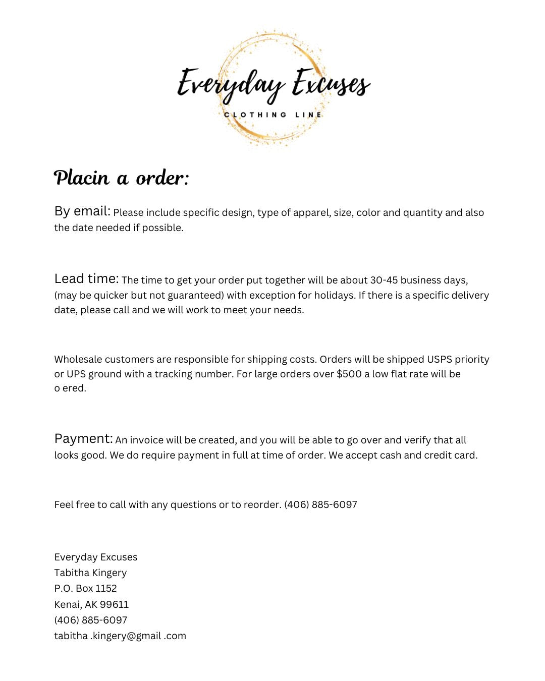 Are you looking to stock up or purchase in bulk for your storefront? Everyday Excuses provides discounted wholesale options on our t-shirts, long sleeves, hoodies, hats, stickers, and select mugs. For detailed wholesale pricing or any other inquiries regarding our wholesale offerings, please contact us directly.